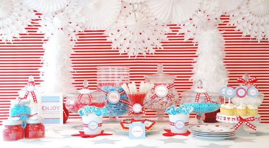 I absolutely love the bright and dynamic backdrop to this holiday dessert table. The red and white striped fabric is offset by elegant, yet whimsical paper flowers and snowflakes. What an enchanting way to set the scene!